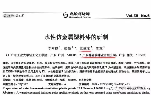 近期分別在知名雜志《絕緣材料》發表了論文《F級絕緣漆用水性聚氨酯的合成及性能研究》和知名雜志《電鍍與涂飾》發表了論文《水性仿金屬塑料漆的研制》。